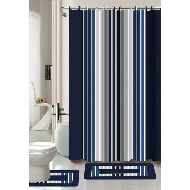 15 Piece Bathroom Set 2 Rugs Mats Non Slip 1 Fabric Shower Curtain With 12 Fabric Covered Rings Different Styles And Colors For Home Bath Decor Stripe Navy Walmart Com